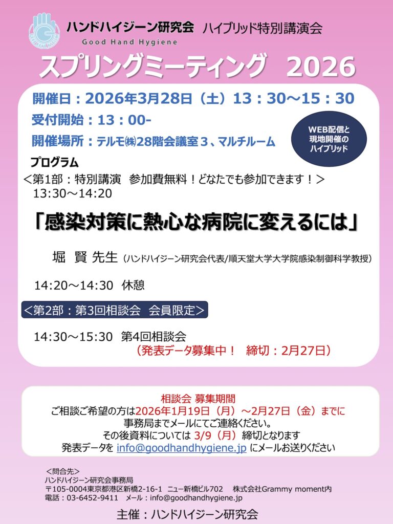 2026年3月28日(土)に「ハンドハイジーン研究会 スプリングミーティング 2026」を開催します。